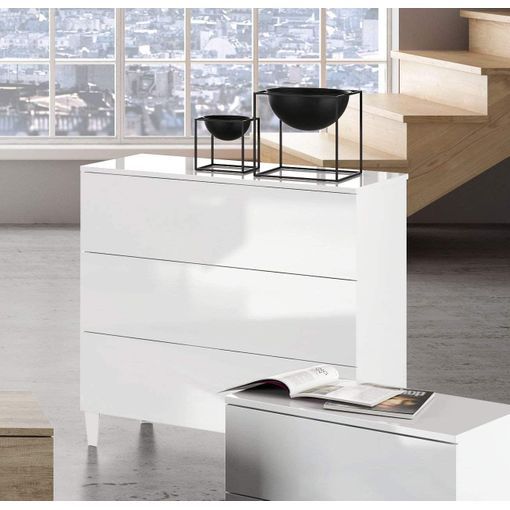 La cómoda con 3 cajones y patas, en elegante color blanco brillo, ofrece una solución de almacenaje ideal para espacios reducidos sin sacrificar estilo ni funcionalidad. Con unas dimensiones de 80x80x40 cm, este mueble auxiliar proporciona un tamaño intermedio que se adapta perfectamente a diversas necesidades de organización en el hogar. Fabricada en melamina de alta calidad y con patas resistentes de PVC, esta cómoda garantiza durabilidad y resistencia a lo largo del tiempo.