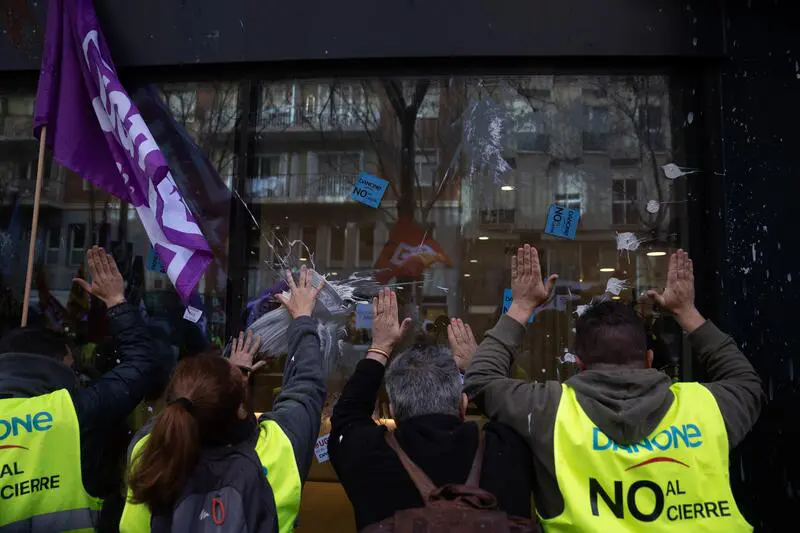 Unas 250 personas han lanzado este lunes yogures y huevos, han encendido bengalas y han puesto pegatinas en la sede de Danone España en Barcelona para protestar contra el cierre de la planta en Parets del Vallès (Barcelona).