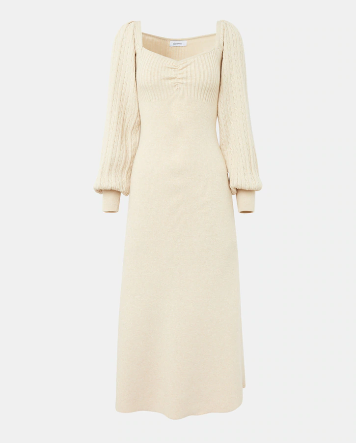 Este vestido largo de punto es impresionante y muy favorecedor gracias a su escote en forma de corazón, que resalta la figura femenina. Las mangas ligeramente abullonadas con punto aranes de ochos y los puños ajustados le dan un toque único y elegante. Con un corte ajustado y entallado, este vestido favorece la silueta. El color crudo es versátil y fácil de combinar con diferentes accesorios y calzado. Además, el material de viscosa y nylon proporciona suavidad y comodidad al tacto.