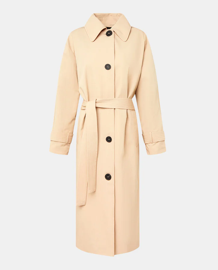 Esta gabardina oversize repelente al agua es una prenda imprescindible para tu armario. Con un cierre mediante botones y un cinturón del mismo tejido en color beige, esta prenda clásica es perfecta para cualquier estilismo. El cierre con botones y la cinta en la cintura para cerrar con una lazada añaden detalles elegantes y funcionales. Además, su composición de algodón y nylon garantiza durabilidad y resistencia al agua.