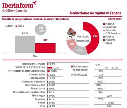 El importe total de las reducciones de capital ha caído en un 43% en enero, hasta los 915 millones de euros, frente a los 1.615 millones en el mismo mes de 2023, según Iberinform (Crédito y Caución), que analiza los datos del Registro Mercantil.