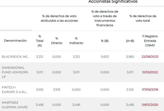 Después de Blackrock, en segundo lugar, está el magnate mexicano David Martínez Guzmán, que tiene el 3,495%. En el tercer puesto se encuentra Fintech Europe SARL, controlada por David Martínez Guzmán, que cuenta con un 3,105%. El cuarto máximo accionista de Banco Sabadell es el fondo Dimensional Fund, con un 3,011%.