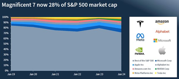 La gran historia del año pasado en la renta variable estadounidense fue el comportamiento de los siete magníficos. Los siete grandes valores tecnológicos de EE.UU., que realmente impulsaron la mayor parte de los rendimientos de la Bolsa estadounidense. Lo interesante es ver cómo ha crecido la presencia de esas siete grandes empresas tecnológicas como parte del índice S&P 500.