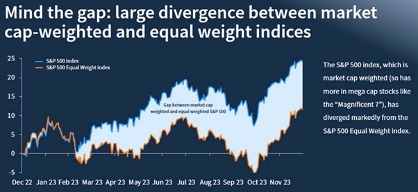 Sin embargo, si se excluyen ‘las siete magníficas’, se puede ver que, desde una perspectiva igualmente ponderada de diluir esos pesos, la media de las acciones de EE. UU. presenta un rendimiento mucho más plano. De hecho, hasta el tercer trimestre, la media de las acciones estadounidenses fue plana en el año. Sólo en los tres últimos meses del año. La compañía media estadounidense sí repuntó y acabó obteniendo algunas ganancias.