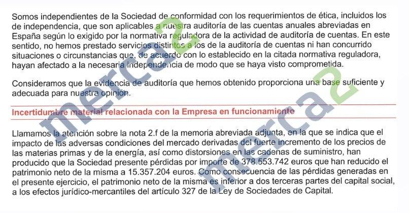 No obstante, recordando que están en un proceso de reestructuración de la deuda y la recapitalización, la operación que tenían prevista para 2023 era una recapitalización por el importe de 250 millones de euros. En ese sentido, los accionistas manifestaron su apoyo a los términos esenciales de la reestructuración, como señalan los auditores de PwC. «Las presentes cuentas anuales de 2022 se han preparado bajo el principio de empresa en funcionamiento, dado que los administradores consideran que las medidas anteriores permitirán que la sociedad continúe con sus operaciones», han avisado desde PwC.