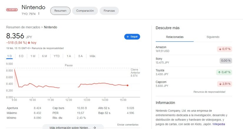 Las acciones de Nintendo se han desplomado en bolsa nada menos que un 6% tras anunciar que su gran apuesta novedosa, la segunda versión de la exitosa consola Switch, retrasará su salida al mercado. Nintendo cayó este lunes en la bolsa nipona después de que los medios de comunicación y las agencias de valores informaran de que su esperada consola de próxima generación no estaría en las tiendas durante este años y su aparición se retrasa hasta principios de 2025.