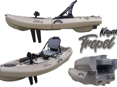 Se trata del modelo ‘Tropel’, un monoplaza fabricado en polietileno, dotado de pedalera de aletas, pensado para poderlo plegar cómodamente, colocando una pieza encima de la otra. Se trata de un kayak que viene completamente equipado para la pesca.