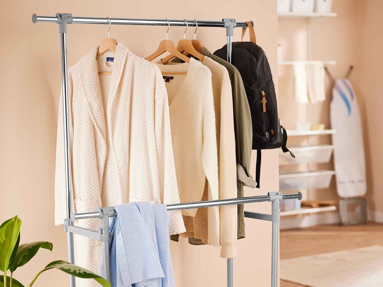 Con prácticos cierres automáticos rápidos y barras para colgar la ropa con regulación continua de la altura, este perchero se adapta a tus necesidades específicas. Además, cuenta con espacios extra para colgar ropa en los 4 extremos extraíbles, lo que lo convierte en una opción ideal tanto para prendas cortas como largas. La rejilla resistente para hasta 3 pares de zapatos te permite mantener tu calzado ordenado y accesible.