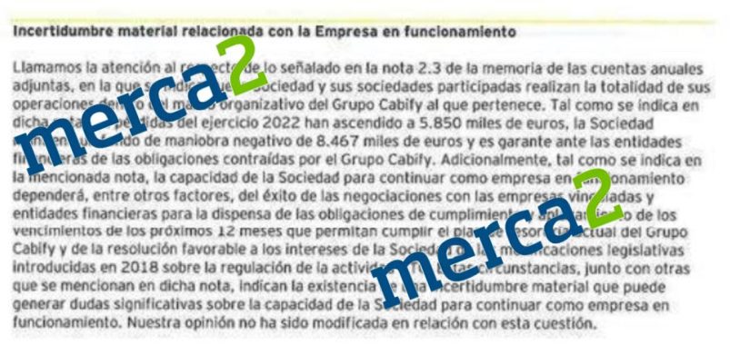 En esta explicación relativa al epígrafe «Incertidumbre material relacionadas con la Empresa en funcionamiento», la auditora deja claro que Cabify S.L. puede desaparecer. «Estás circunstancias, junto con otras que se mencionan en dicha nota, indican la existencia de una incertidumbre material que puede generar dudas significativas sobre la capacidad de la Sociedad para continuar como empresa en funcionamiento».