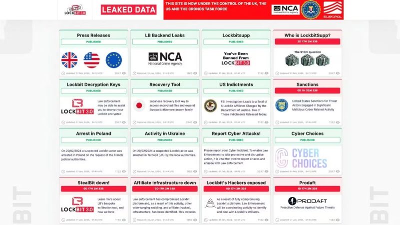 La NCA, el FBI y Europol transformaron el sitio web de filtraciones Lockbit en un sitio de filtraciones sobre la propia banda criminal, en el que las agencias policiales internacionales publicaron datos internos del grupo y relojes de cuenta atrás que amenazaban con revelar próximas sanciones y la identidad del cabecilla de Lockbit, «LockbitSupp».