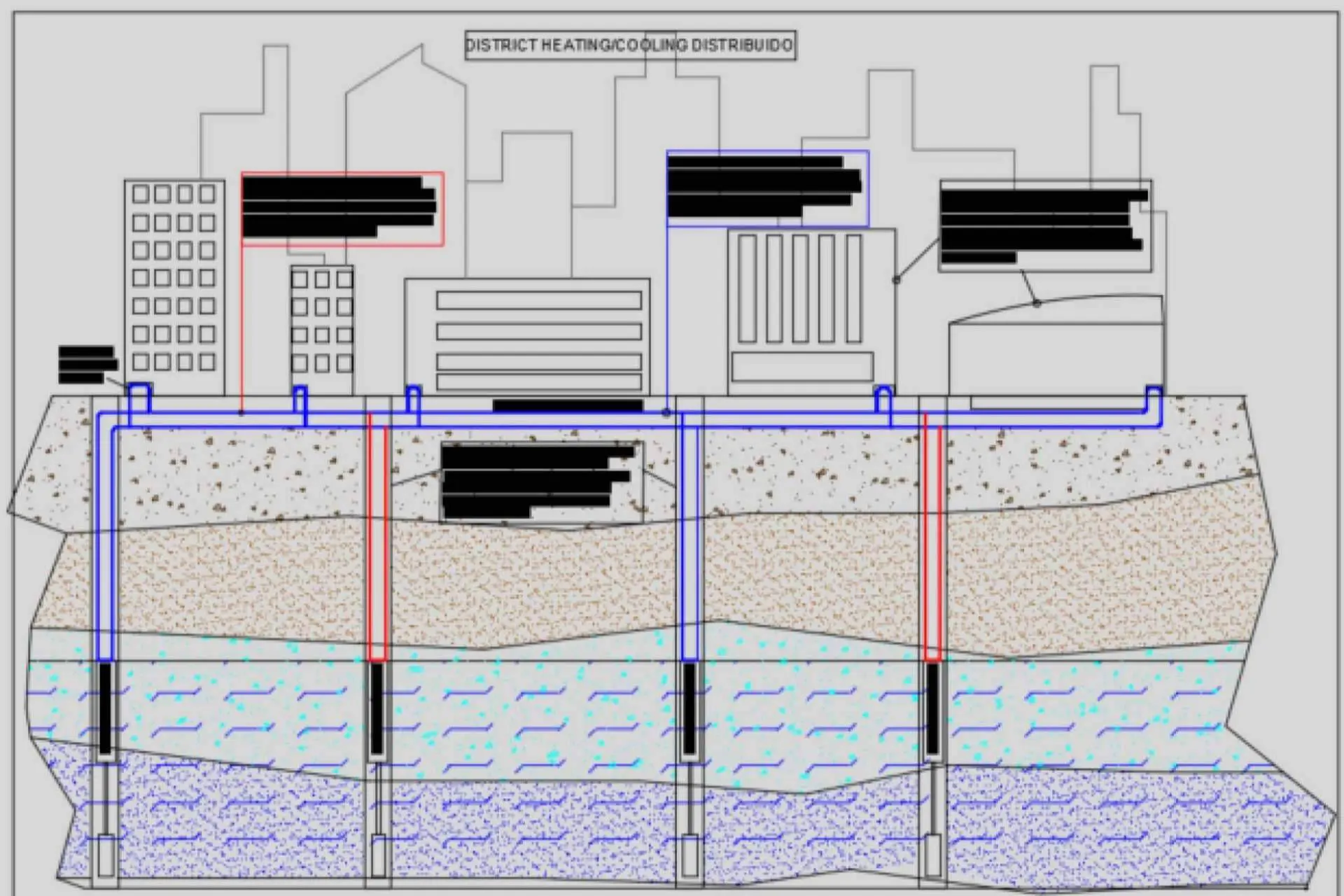 La distribución estratégica de perforaciones geotérmicas a lo largo del anillo de distrito amplía el acceso a un extenso volumen de subsuelo, aprovechando una cantidad considerable de energía. La flexibilidad adicional de conectar diferentes demandas de frío y calor simultáneamente en el mismo anillo de distrito optimiza el sistema, permitiendo la transferencia y compensación de energía entre diferentes partes del anillo sin necesidad de generarla adicionalmente.