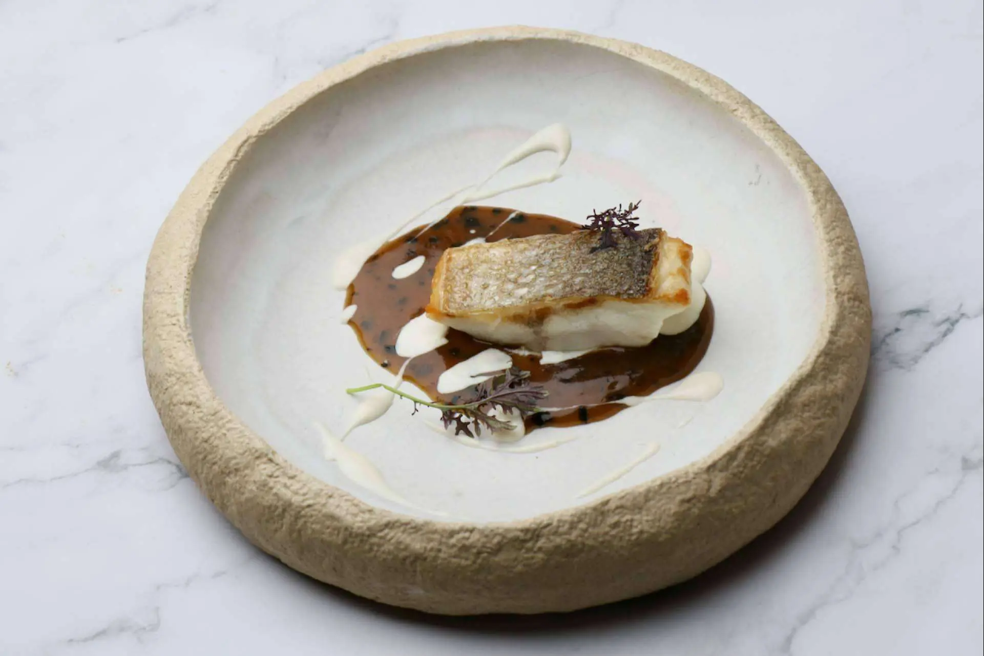 Naveira llegaba al momento previo del postre con un pescado que conoce y domina, ‘LUBINA’, una lubina a la brasa que acompañaría con el más importante vino tinto de Gancedo, Ucedo 2021, elaborado con la variedad Mencía.