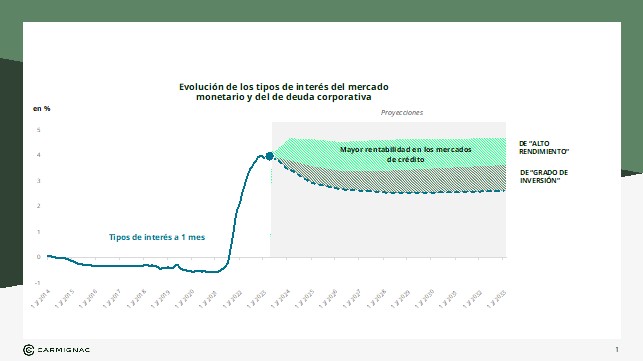 Thozet (Carmignac) añade que es importante garantizar desde ya una rentabilidad atractiva para el futuro. Los mercados de deuda corporativa ofrecen una rentabilidad adicional que un inversor puede obtener en los próximos trimestres, o incluso años: la zona sombreada en verde en el gráfico corresponde a la rentabilidad adicional que ofrecen actualmente los mercados de deuda corporativa en comparación con los tipos del mercado monetario. En otras palabras, cualquier inversor que opte por mantener sus posiciones en los mercados monetarios o que retrase la reasignación de su capital «dejará de embolsarse ganancias». Esta merma de rentabilidad, de entre el 1% y el 2% anual, dista mucho de ser insignificante.