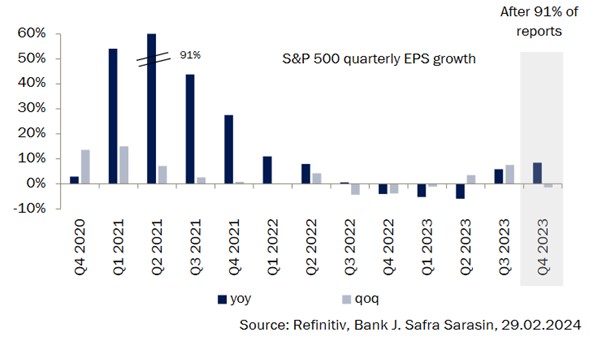 Más del 90% de las compañías de EE.UU. (S&P 500) ya han presentado sus resultados del cuarto trimestre de 2023, por lo que la temporada está llegando a su fin. El crecimiento del BPA ha sido mayor de lo esperado al principio de la temporada, con un 8,5% interanual para todo el índice.