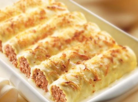 - Cubre los canelones con salsa bechamel y espolvorea generosamente con queso rallado.