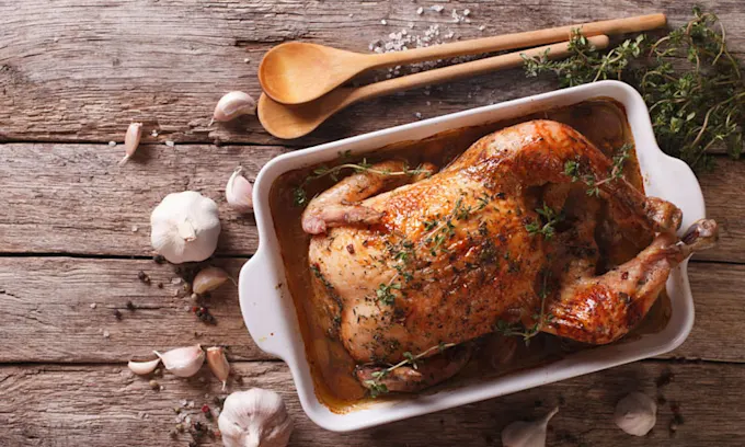 - Hornea el pollo en el horno precalentado durante aproximadamente 1 hora y 15 minutos, o hasta que esté bien dorado y cocido por completo. Para asegurarte de que el pollo esté listo, inserta un termómetro de cocina en la parte más gruesa del muslo; la temperatura interna debe alcanzar los 75°C (165°F).