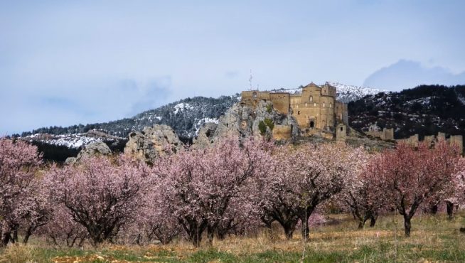 Loarre, ubicado en Huesca, presume de ser la fortaleza románica mejor conservada de Europa, y en estos días se embellece aún más con la presencia de miles de flores blancas y rosadas de los almendros, anunciando la llegada de la primavera. Este espectáculo natural proporciona el telón de fondo perfecto para uno de los castillos más fascinantes de España, una joya de la arquitectura civil y militar aragonesa.