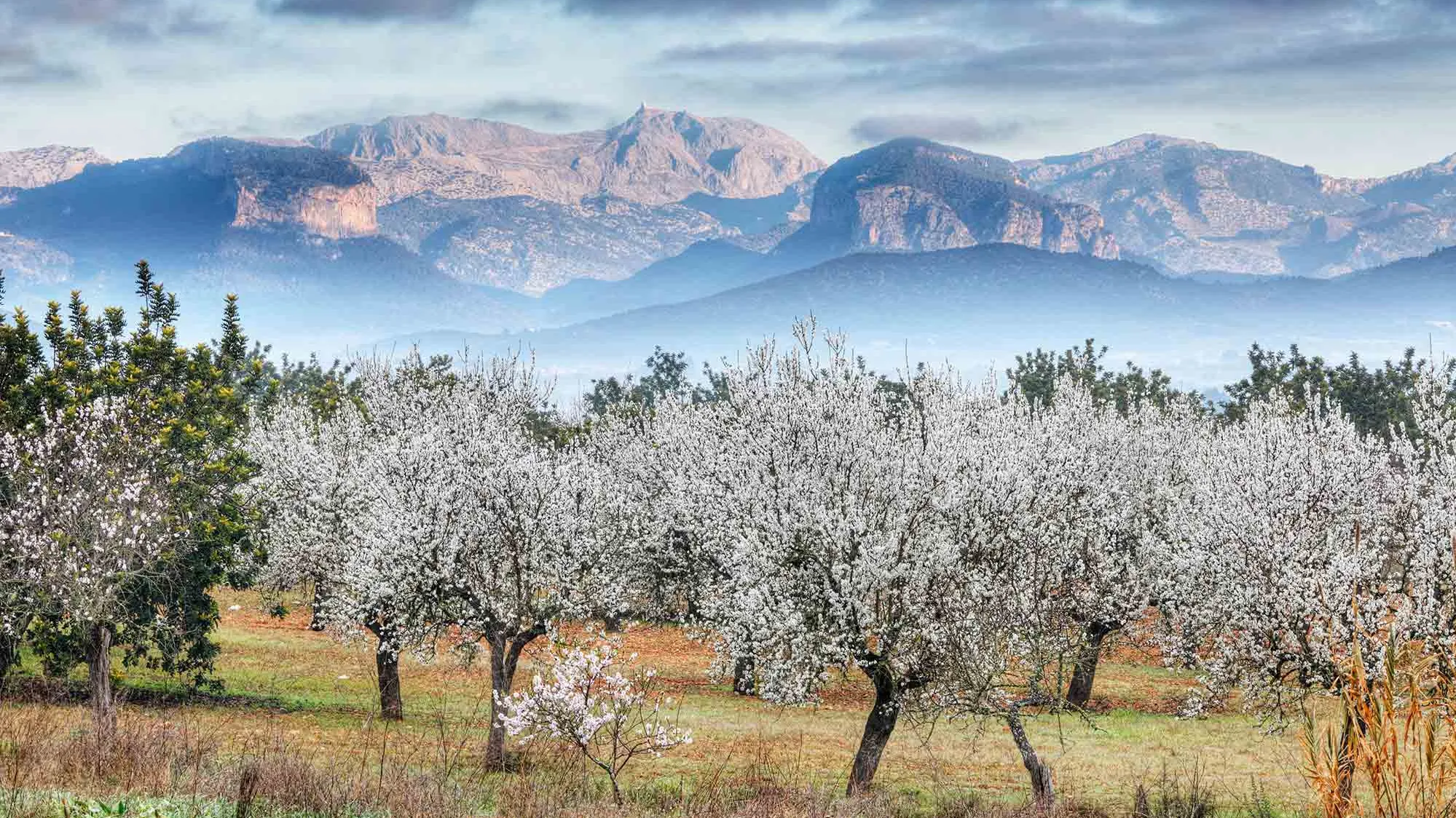 La Sierra de la Tramuntana en Mallorca es un espectáculo impresionante durante la temporada de floración de los almendros. Los campos mallorquines se transforman en un hermoso lienzo blanco y rosado, gracias a las flores de los almendros dulces y amargos que adornan el paisaje en febrero. Desde Llucmajor hasta poblaciones como Manacor, Sant Llorenç y Son Servera, en el centro y oeste de la isla, pasando por el pueblo de Selva hasta Moscari, hay numerosas zonas donde se puede disfrutar de esta belleza natural.