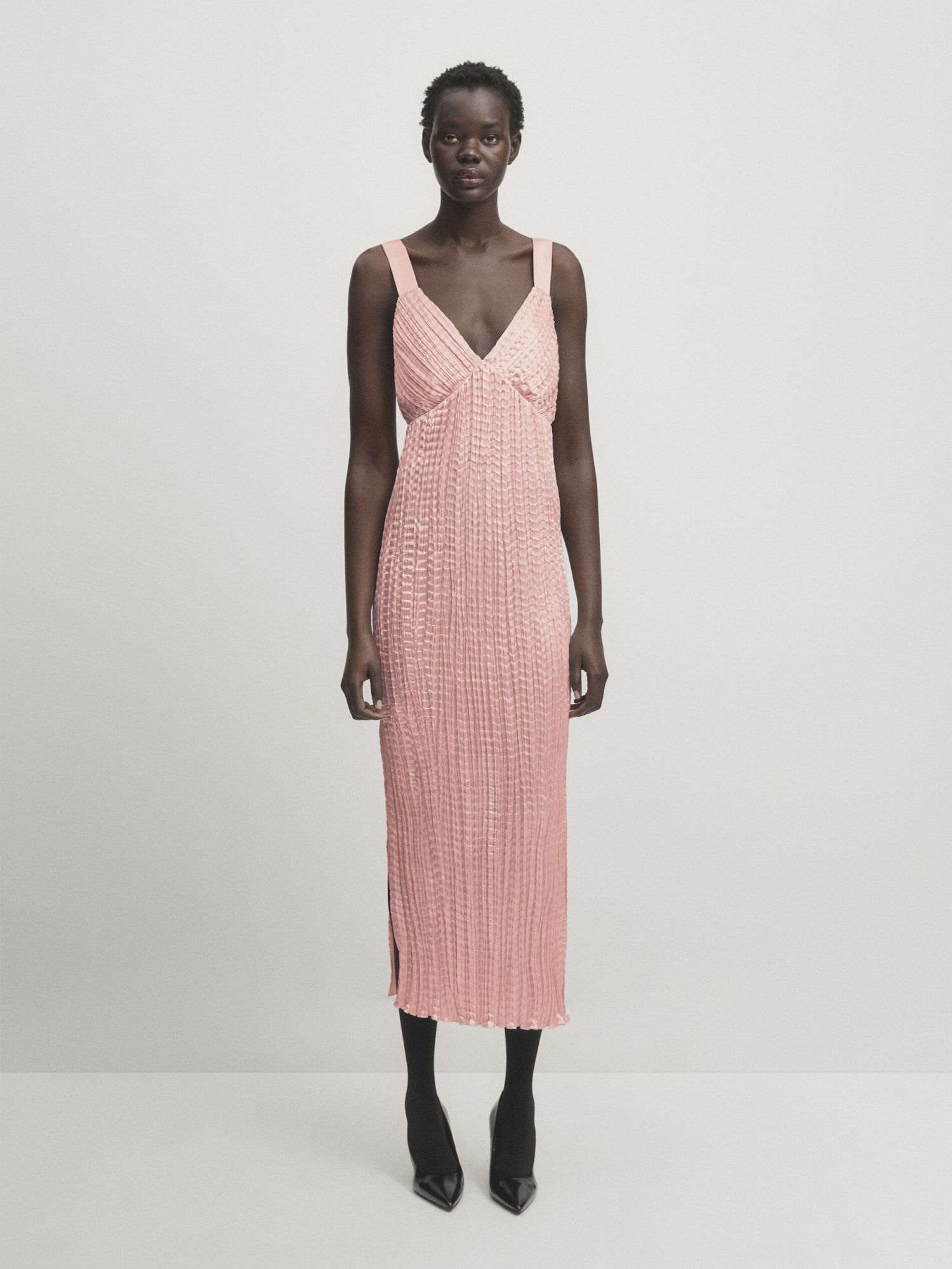 Sumérgete en la elegancia con el vestido plisado satinado aberturas de Studio, una prenda que deslumbra con su encanto y exquisitos detalles. Confeccionado en un tejido plisado con acabado efecto arrugado y un satinado impecable, este vestido de tirantes en color rosa maquillaje cautiva con su sofisticación y estilo. Su escote en forma de pico y espalda elástica ofrecen un ajuste perfecto, mientras que los detalles de plisado agregan un toque de distinción a la prenda, convirtiéndola en una opción ideal para diversas ocasiones.