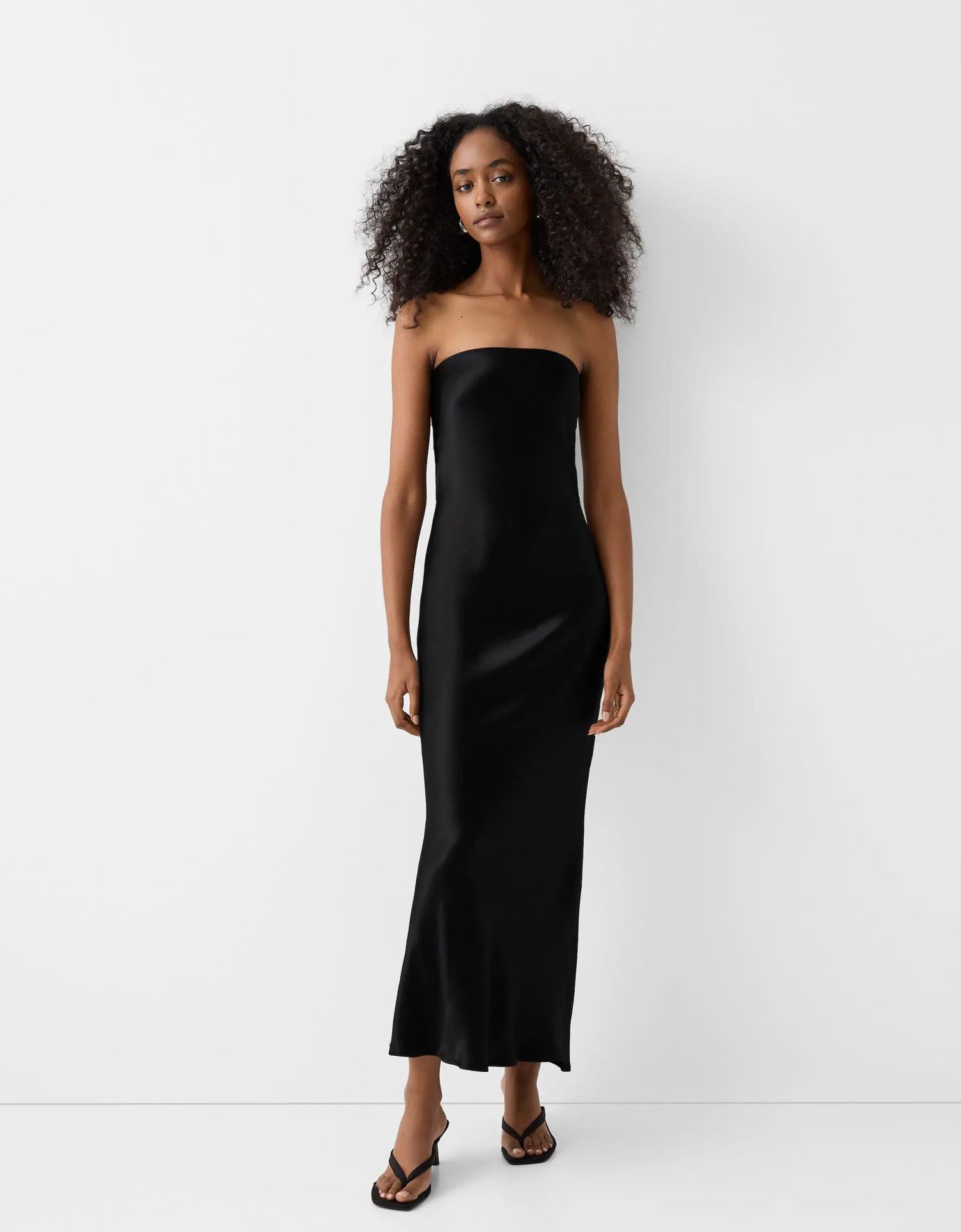 Este vestido de palabra de honor, con detalles joya y un estilo atemporal, te transportará a la era dorada de Hollywood, donde la elegancia y la distinción reinaban en la alfombra roja. Acompañado por guantes largos que recuerdan a las musas del cine clásico como Audrey Hepburn y Marilyn Monroe, este diseño promete ser la joya de tu armario y el centro de todas las miradas en tus ocasiones más especiales. No pierdas la oportunidad de lucir como una verdadera estrella de cine con este magnífico hallazgo de Bershka.