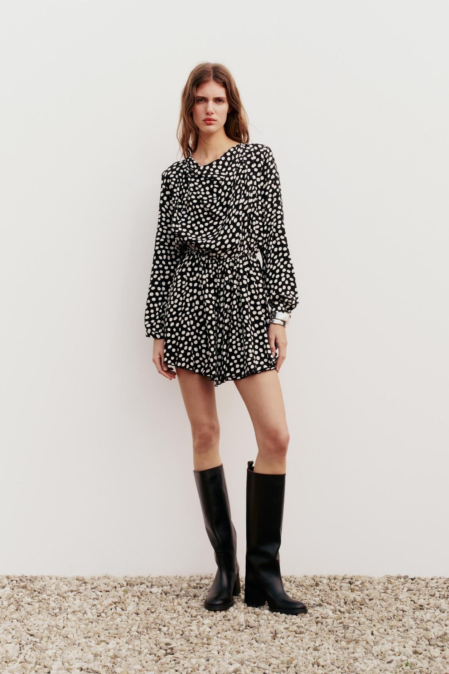 El vestido corto estampado de lunares de Zara es una pieza encantadora que añadirá un toque de estilo a tu armario primaveral. Con un cuello fluido y manga larga, este vestido ofrece una silueta femenina y elegante. La cintura elástica con frunces proporciona comodidad y ajuste, realzando la figura de manera favorecedora. El estampado de lunares agrega un toque de sofisticación y diversión a este versátil vestido.