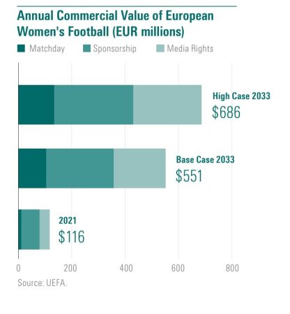 La UEFA tiene grandes expectativas para el negocio del fútbol femenino y prevé que el valor comercial anual en Europa crezca casi seis veces hasta alcanzar los 686 millones de euros en 2033, frente a los 116 millones de euros en 2021. Se espera que los ingresos aumenten en todos los segmentos de negocio, a saber, los partidos, los medios de comunicación/transmisiones y el patrocinio.