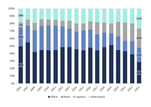 Sin embargo, el descenso de las inversiones no afectó homogéneamente a todas las clases de activos. De hecho, los inversores han intensificado sus estrategias de diversificación. Como resultado, los activos alternativos representaron el 27% de las inversiones en 2023 (un aumento relativo en comparación con 2022).