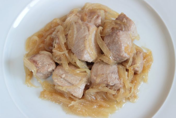 - Coloca los filetes de bonito dorados sobre un lecho de cebollas caramelizadas.