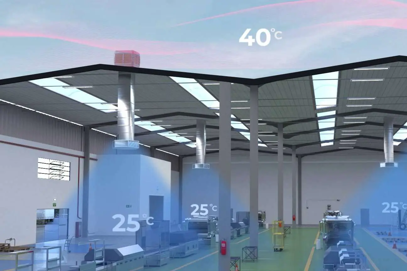 La climatización de grandes espacios industriales y comerciales ha constituido históricamente un reto para los fabricantes de sistemas de climatización convencional, los sistemas de aire acondicionado son muy poco eficientes en espacios con techos altos y zonas abiertas. Su elevado consumo los convierte en una opción no viable para las industrias y suponen un gran esfuerzo económico para los espacios comerciales.