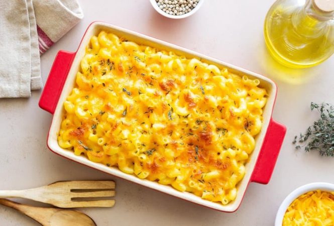 - Vierte la mezcla de macarrones en la fuente para horno preparada y espolvorea el queso cheddar rallado restante por encima.