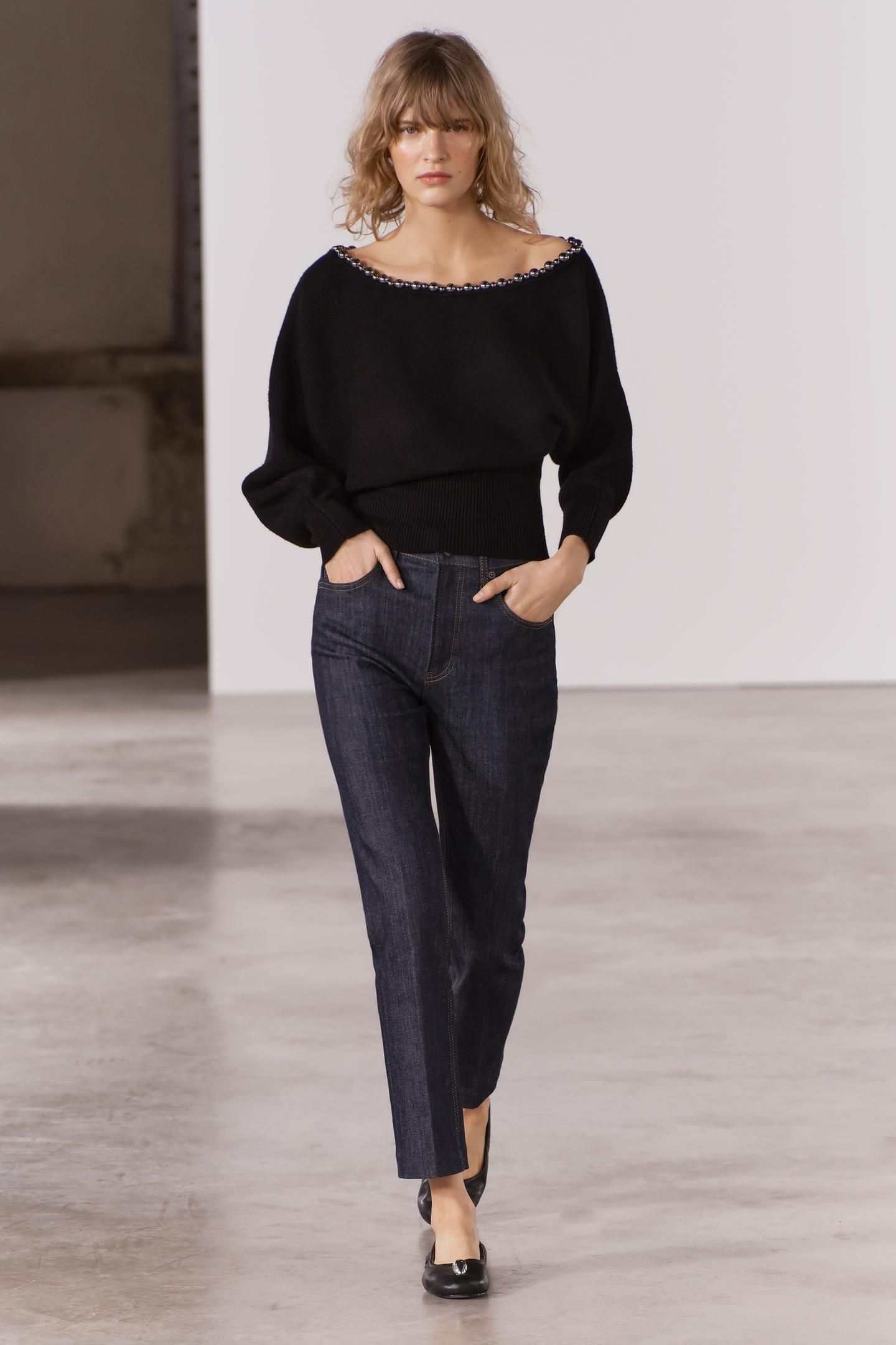 El jersey de punto con bolas metálicas de ZARA, con un precio de 29,95 EUR, es una opción elegante y llamativa para la temporada de entretiempo. Con un cuello amplio y aplicación de bolas metálicas, este jersey presenta una manga larga con sisa ancha, estrechándose hacia la muñeca, lo que le confiere un estilo moderno y sofisticado.