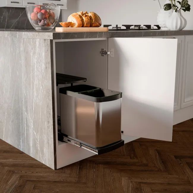Leroy Merlin presenta el cubo de basura EMUCA 20/30L extraíble, una solución práctica y funcional para la gestión de residuos en el hogar. Este cubo de reciclaje es ideal para separar y clasificar los desechos domésticos gracias a sus dos compartimentos protegidos por una carcasa de acero inoxidable. Su estructura cuenta con guías de bolas con extracción total, lo que facilita el acceso a los cubos de forma manual o automática si se fija a la puerta del mueble. Con una capacidad de 12 litros cada uno, estos cubos ofrecen espacio suficiente para gestionar los residuos diarios de manera eficiente.