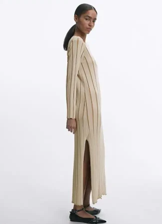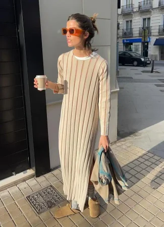 El centro de este look es, sin duda, el encantador vestido midi de punto de la nueva colección de Parfois. A primera vista, su diseño minimalista podría parecer simple, pero es precisamente su simplicidad la que lo hace tan versátil y atractivo. Decorado con un estampado de rayas canalé en tonos beige y camel, este vestido sigue las tendencias de la temporada, adaptándose también a diferentes tipos de cuerpo gracias a su tejido elástico. Una elección que abraza suavemente las curvas y te hace sentirte ligera y a gusto.