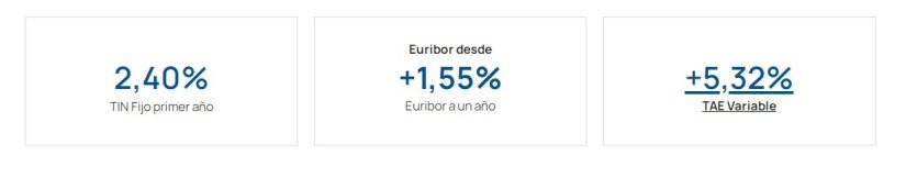Para plazo de 30 años: TAE Variable del 5,32%. Tipo de interés nominal (TIN): Fijo primer año: 2,40 %; Variable: Euribor a un año +1,55 % (revisiones anuales). El último valor del Euribor a un año publicado en el BOE de fecha 02/03/2024 es 3,671%. El tipo de interés resultante de la suma de este valor más el diferencial antes indicado es 5,221%. Cuotas primer año: 780,08€ Posterior: 1.091,45€ Excepto la última cuota que es 1.094,46€ partir del segundo año para el cálculo de las cuotas, intereses totales, el coste total y el importe total adeudado se ha aplicado el tipo deudor más alto entre el tipo fijo inicial y el índice de referencia (Euribor a un año con publicación mensual en el BOE) más el diferencial, por ello, las cuotas han sido calculadas teniendo en cuenta el T.I.N. del 5,221%.