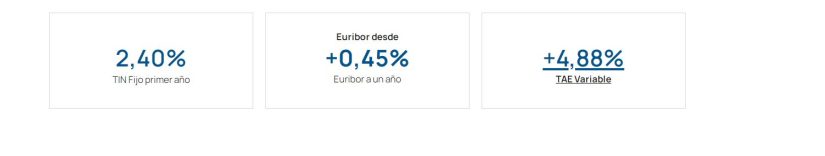 Para plazo de 10 años: TAE Variable 5,07%. Tipo de interés nominal anual (TIN): Fijo primer año: 2,40 %. Variable: Euribor a un año +1,55 % (revisiones anuales). El último valor del Euribor a un año publicado en el BOE de fecha 02/03/2024 es 3,671%. El tipo de interés resultante de la suma de este valor más el diferencial antes indicado es 5,221%. Cuota primer año: 1.876,54€. Posterior: 2.117,17€ Excepto la última cuota que es 2.117,04€. A partir del segundo año para el cálculo de las cuotas, intereses totales, el coste total y el importe total adeudado se ha aplicado el tipo deudor más alto entre el tipo fijo inicial y el índice de referencia (Euribor a un año con publicación mensual en el BOE) más el diferencial, por ello, las cuotas han sido calculadas teniendo en cuenta el T.I.N. del 5,221%.