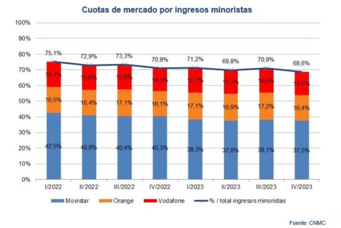 Por cuota de mercado, Movistar, Vodafone y Orange captaron entre octubre y diciembre de 2023 el 68,6% de los ingresos minoristas del sector, es decir, 2,4 puntos porcentuales menos que en el mismo periodo del ejercicio previo. Movistar redujo sus ingresos respecto a los del cuarto trimestre de 2022, mientras que los de Vodafone, Orange y Grupo MásMóvil fueron superiores a los de hace un año.