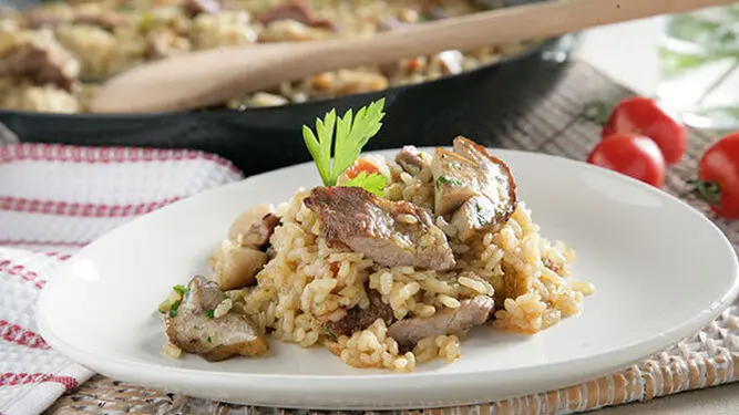 - Sirve el arroz con secreto ibérico y boletus caliente, decorado con los boletus reservados y un poco de perejil fresco picado si lo deseas.