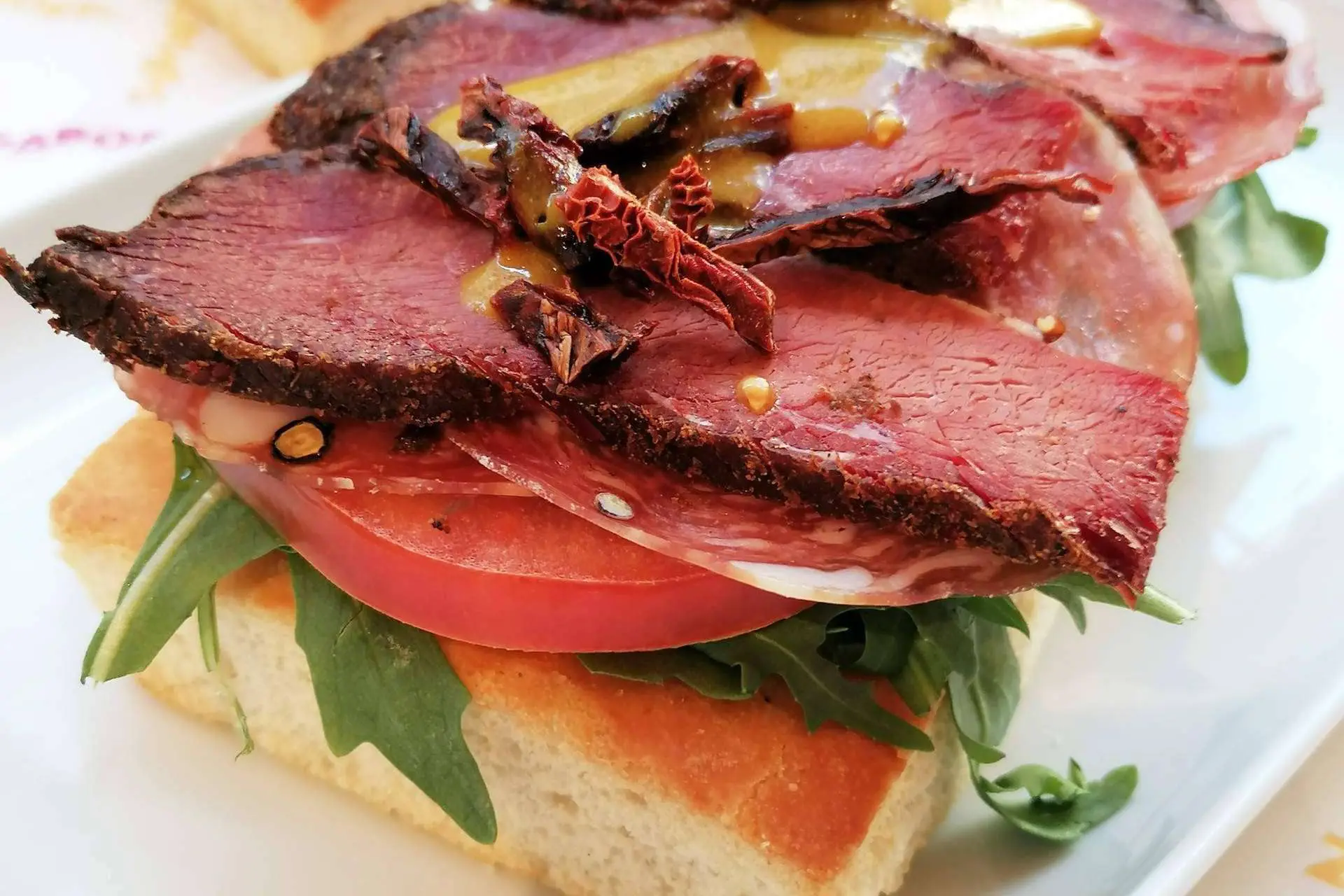 El brunch de Saboriz destaca por su acertada selección de platos. Entre las opciones, los comensales pueden elegir focaccias italianas, con variantes que van desde la clásica de salmón y queso fresco hasta una versión vegetariana con hummus, aguacate y tomate, sin olvidar la especial de la casa con el pastrami artesanal elaborado por ellos mismos, rúcula y tomates secos.