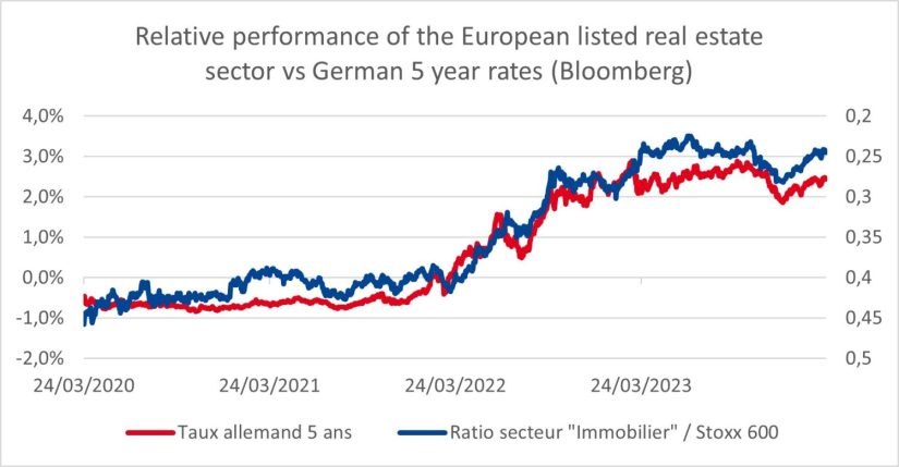 - Inmobiliario europeo cotizado. Con una caída del 37% en el periodo comprendido entre el 5 de enero de 2022 y el 19 de marzo de 20241, mientras que el índice (Stoxx 600) avanzaba marginalmente, el sector inmobiliario europeo cotizado es probablemente el que más ha sufrido la subida de los rendimientos de los bonos. El siguiente gráfico ilustra la correlación del sector con los movimientos de los tipos de interés. Para el sector, es fundamental asistir al inicio de la normalización de los tipos de interés, así como a un descenso de los tipos a largo plazo.