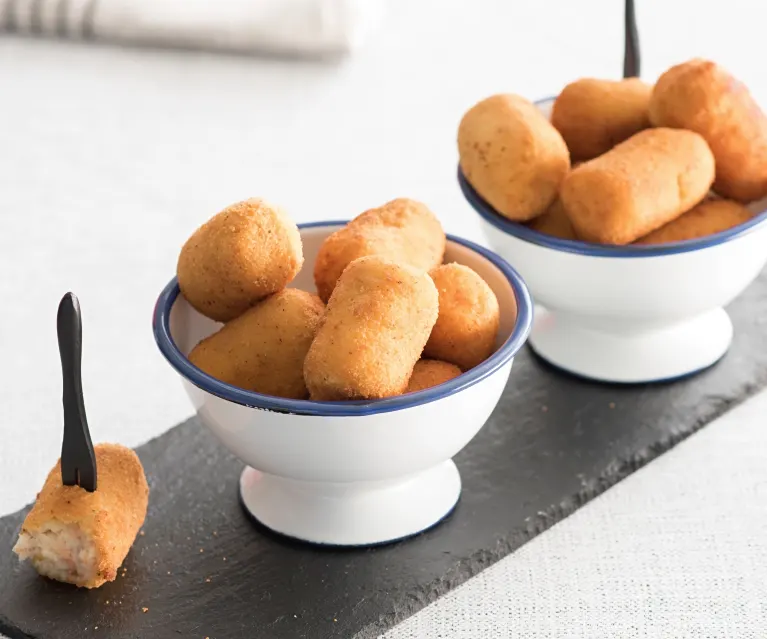 Las croquetas son un plato típico de la gastronomía española que se elabora con una masa de bechamel y otros ingredientes como carne, pescado, setas, verduras, etc., que se rebozan en huevo y pan rallado para luego freírse.