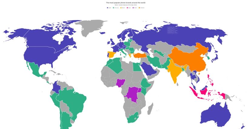 Cuando los analistas de John’s Phones analizan los datos por zonas geográfica o por países, el ranking varía respecto a las cifras internacionales. Ellos analizan qué marcas dominan los mercados locales en todo el mundo, en un total de 65 países, y elaboran un mapa con sus colores significativos.