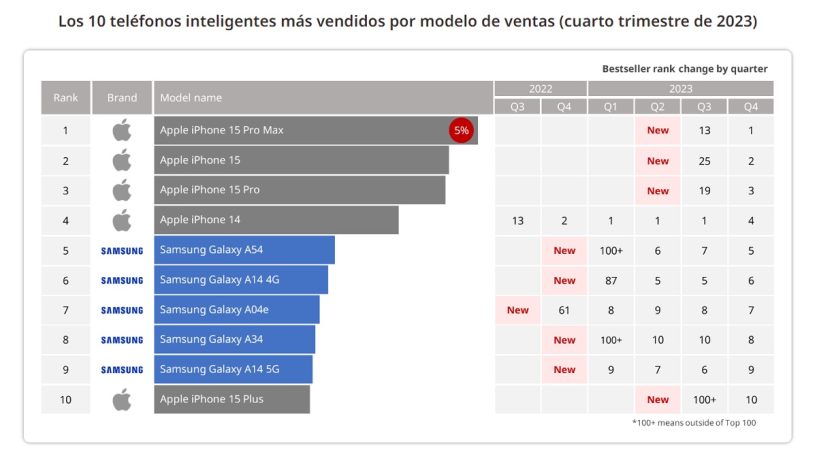 Apple y Samsung copan el listado de los 10 primeros a nivel global en el ranking con 5 entradas cada uno. La contribución de los diez principales teléfonos inteligentes aumentó ligeramente hasta el 25% desde el 24% interanual en el cuarto trimestre de 2023. La serie iPhone 15 de última generación se queda con los tres primeros lugares con ese iPhone 15 Pro Max a la cabeza. Con el iPhone 15 Plus en el décimo lugar, la serie completa marcó su presencia en la lista de los diez primeros.