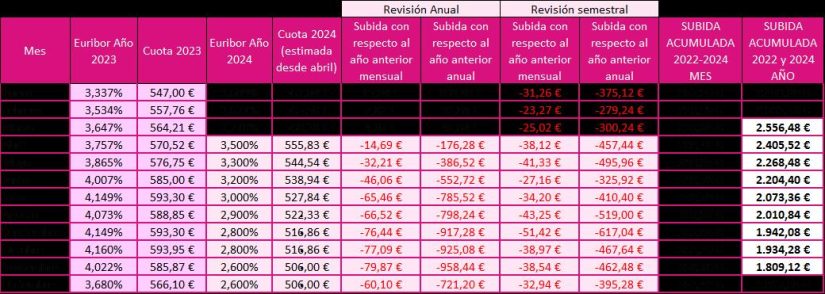 “Los afortunados serán los que tengan una hipoteca con revisión semestral”, explica Riera, “porque el euríbor cotizaba al 4,149% hace un semestre (septiembre de 2023) y, por lo tanto, sus cuotas se abaratarán tras la actualización”. Para el ejemplo anterior, las mensualidades bajarán de unos 889 euros a unos 852 euros, aproximadamente; un descenso de algo más de 37 euros al mes y de unos 225 euros en el conjunto del próximo semestre.