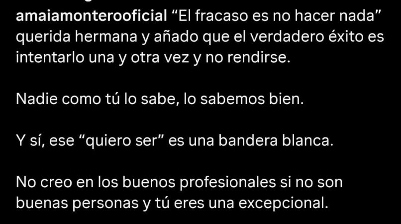 «El fracaso es no hacer nada, querida hermana y añado, que el verdadero éxito es intentarlo una y otra vez y no rendirse. Nadie como tú lo sabe y lo sabemos. Y sí, ese «quiero ser» es una bandera blanca», fueron las palabras con la exvocalista de «La Oreja de Van Gogh« que fueron un mensaje de aliento para Idoia, su hermana. Luego, agregó: «No creo en los buenos profesionales, si no son buenas personas, tú eres excepcional», cerró la cantante, quien apuntó directo para el jurado del reality de cocina.