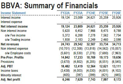 BBVA espera que el beneficio neto se mantenga saludable en 2024 ayudado por el fuerte crecimiento de los préstamos, los elevados tipos de interés medios y el bajo coste de los depósitos, mientras que el coste de riesgo debería normalizarse en torno a 325 puntos básicos en 2024, según el informe.