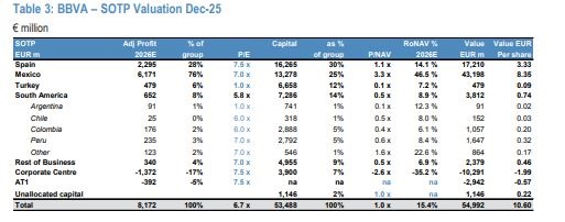 “BBVA resulta atractivo y estamos en sobreponderar. Nuestra precio objetivo se basa en nuestro análisis de valoración SOTP, teniendo en cuenta múltiplos PER históricos que reflejan la calidad relativa de los calidad relativa de los beneficios de las distintas divisiones de negocio y la fortaleza frente a sus homólogas. Nuestro precio objetivo para diciembre de 2025 de 10,60 euros refleja 1,0x 2025E P/NAV [precio sobre valor neto activos] para un RoNAV del 15% [retorno sobre valor de los activos]”.