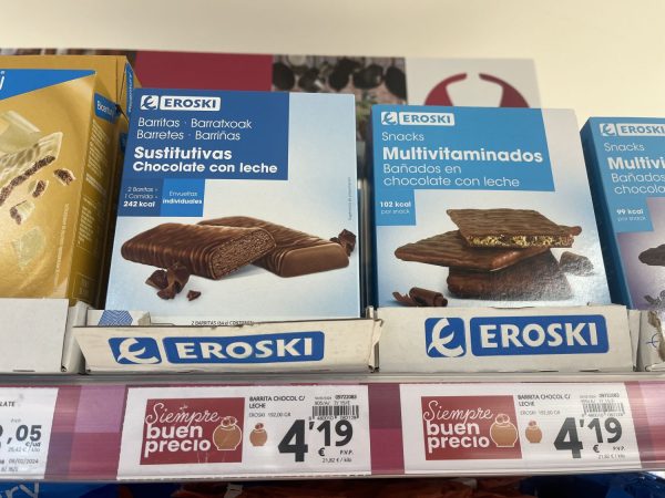 No obstante, en los lineales de snacks podemos observar como Eroski cuenta con barritas de su marca propia y al lado con las de marca del fabricante, en concreto Bicentury. Por ello, Eroski cuenta con sus barritas sustitutivas de chocolate con leche y las de multivitaminas, también con chocolate con leche. El precio de estos productos de marca blanca del supermercado vasco ya alcanzan los 4,15 euros.