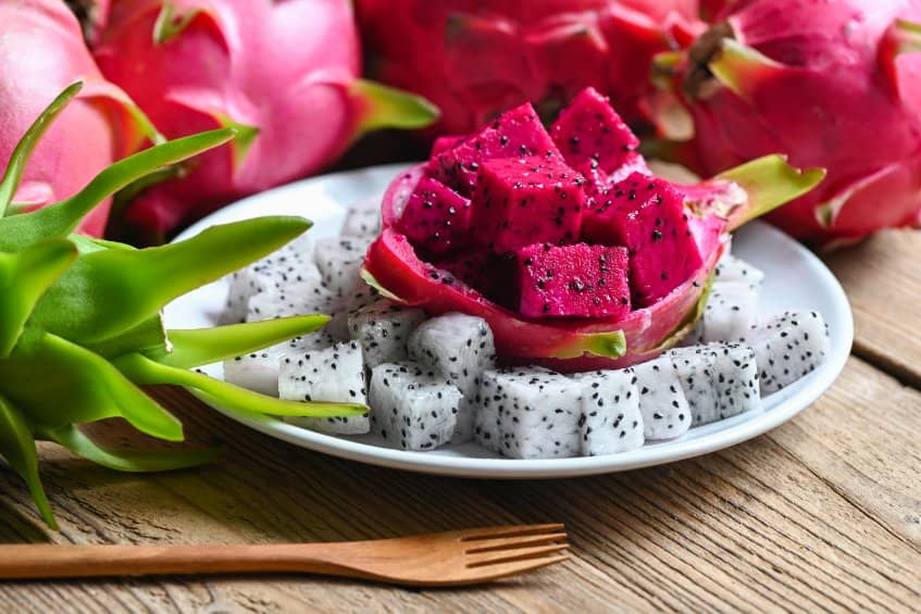 Como es una fruta un tanto extraña, te voy a dejar unas ideas infalibles para que consigas un plato exquisito, lleno de sabor y que impacte en tu piel. Primero puedes cortar la pitaya al medio y sacar con una cuchara la pulpa del interior, ya que todo es comestible menos la piel del exterior, que es un tanto amarga. Puedes cortarla en rodajas como una naranja, o en cubos.