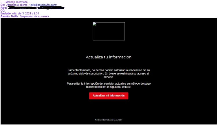 Esta estafa la puede recibir a su correo electrónico cualquiera, sea usuario o no de Netflix. Sin embargo, quienes sí lo son pueden caer con bastante facilidad en la trampa. El asunto del mensa es ya los suficientemente alarmante a poner «Suspensión de la cuenta». Seguidamente indica «actualiza tu información» y explica que «Lamentablemente, no hemos podido autorizar la renovación de su próximo ciclo de suscripción. En breve se restringirá su acceso al servicio».