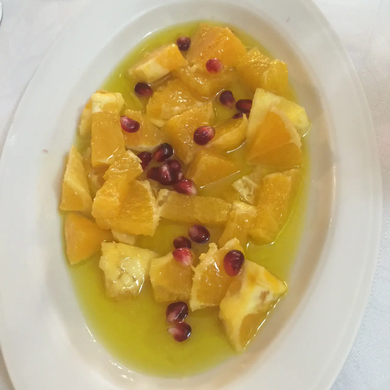 Una vez que ha macerado, el liquido resultante se mezcla con aceite de oliva virgen extra (AOVE) y se añade sobre los gajos de naranja, después incorporamos los granos de granada maduros. En algunos restaurantes, le añaden canela en polvo, que es otra forma de sacarle sabor a la ensalada y darle un toque exótico a un plato que ya lo tiene.